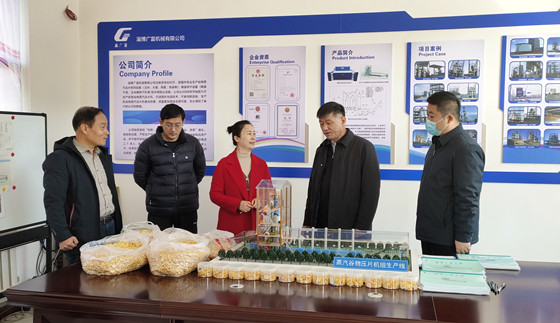熱烈歡迎淄川區(qū)領導蒞臨廣富機械有限公司 調研指導蒸汽玉米壓片機生產工作